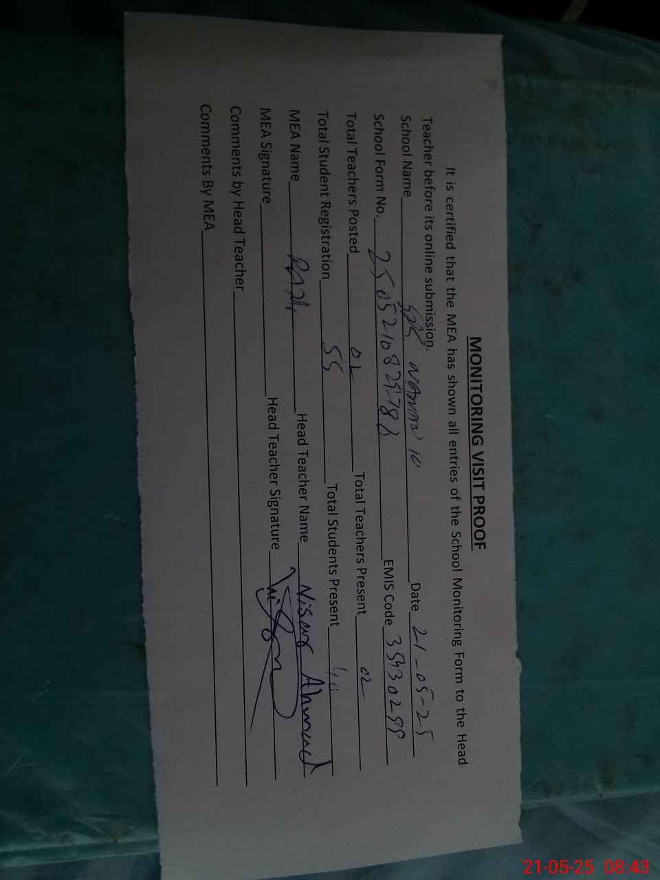 | Attendance Register | Head Teacher | MEA with School | Visit Proof |