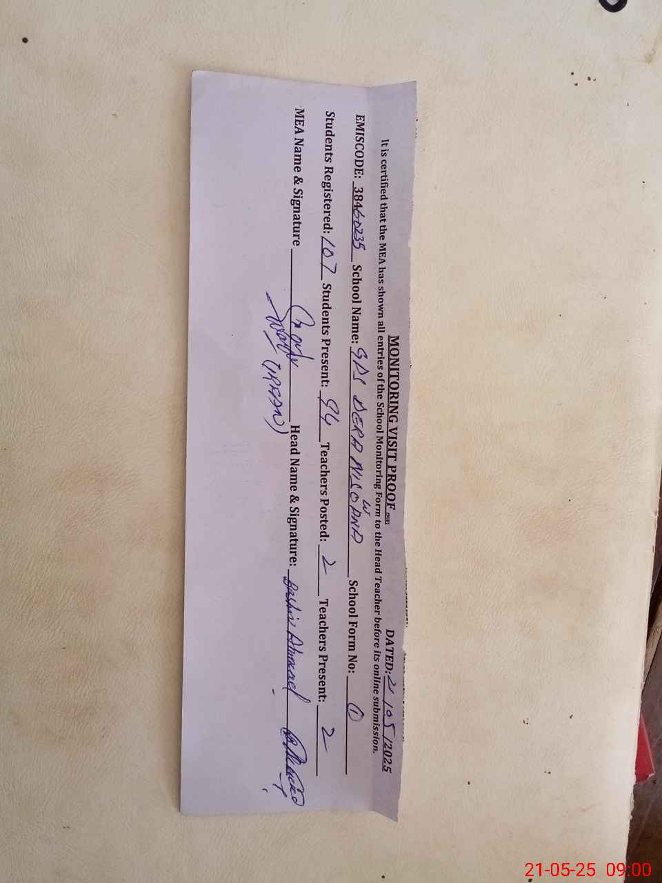 | Attendance Register | Head Teacher | MEA with School | Visit Proof |