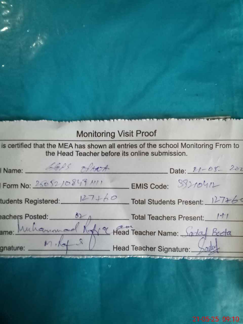 | Attendance Register | Head Teacher | MEA with School | Visit Proof |