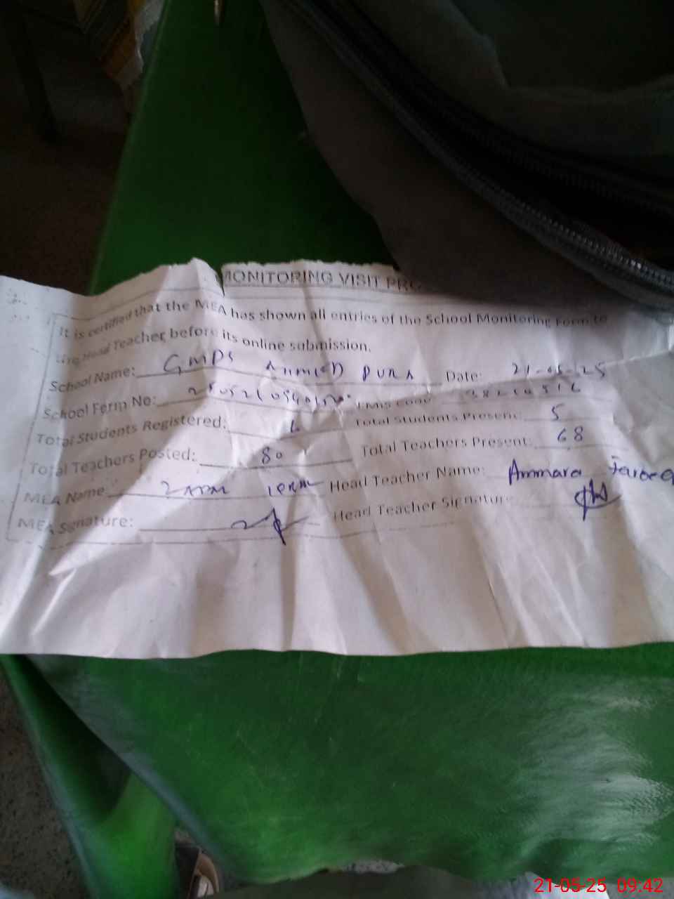 | Attendance Register | Head Teacher | MEA with School | Visit Proof |