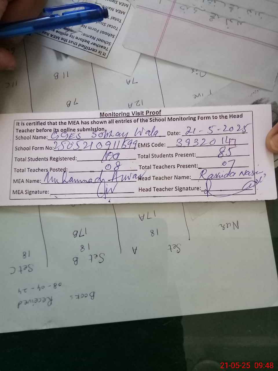 | Attendance Register | Head Teacher | MEA with School | Visit Proof |