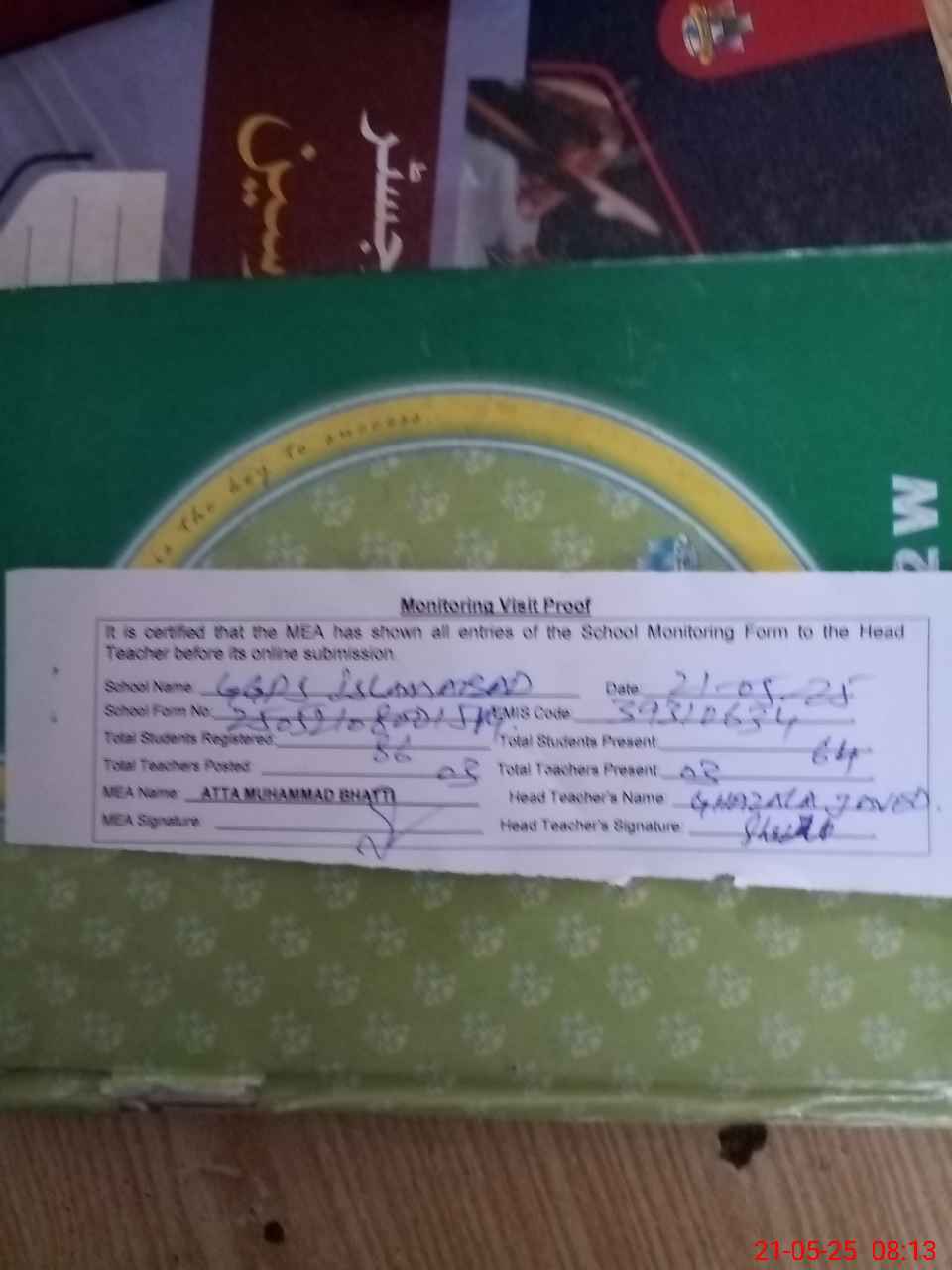 | Attendance Register | Head Teacher | MEA with School | Visit Proof |