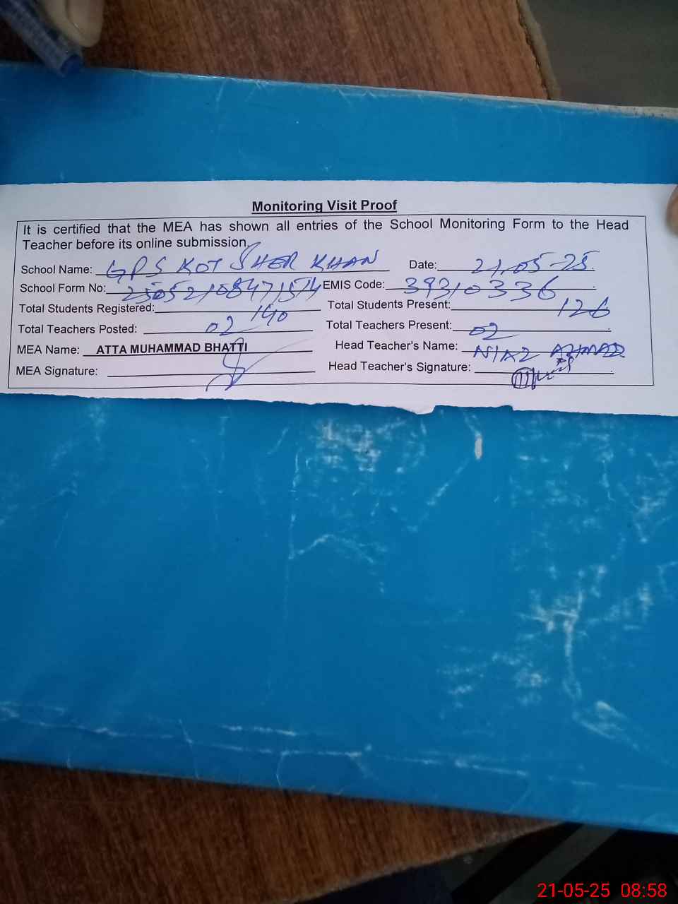 | Attendance Register | Head Teacher | MEA with School | Visit Proof |