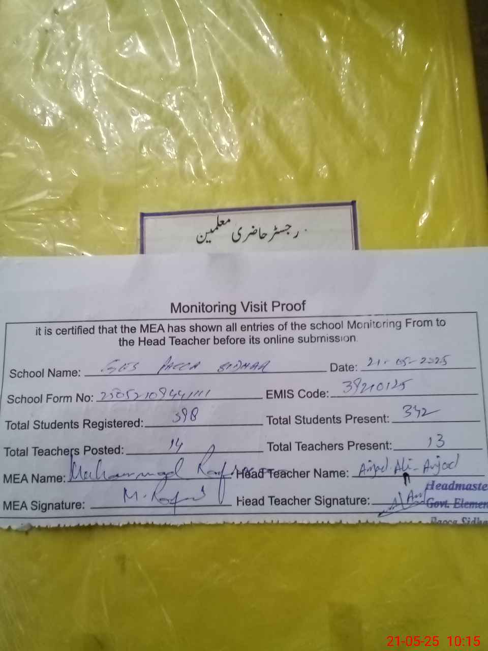 | Attendance Register | Head Teacher | MEA with School | Visit Proof |