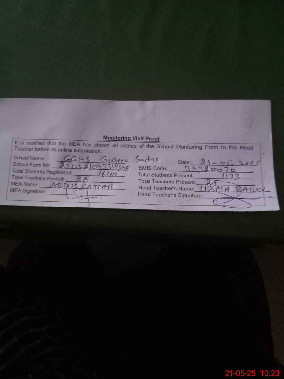 | Name: Uz**** Ba**** Designation: (School Headmaster's/Headmistress's) SST I/C Headmaster Phone/Cell Number: 03**** |