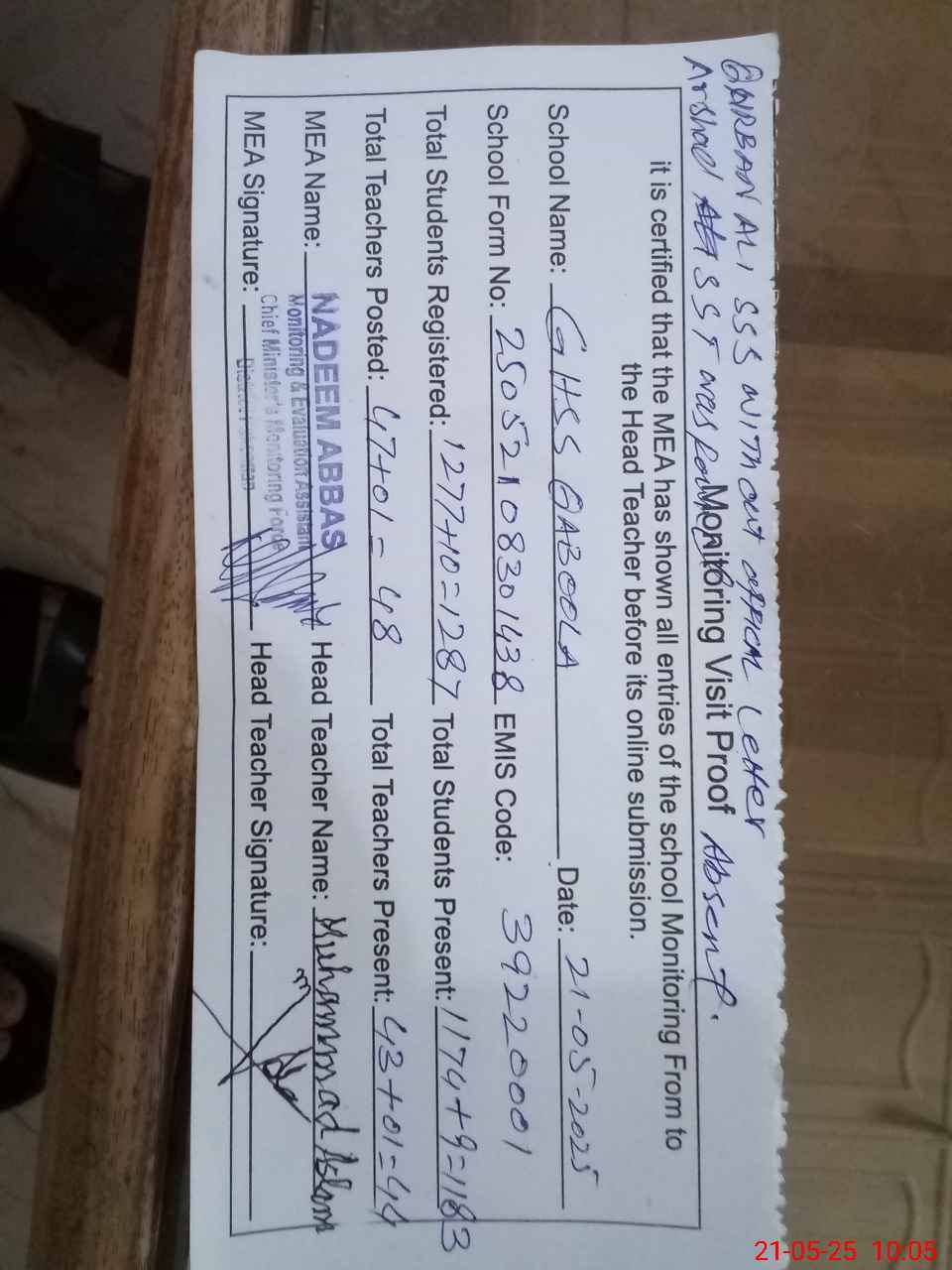 | Remarks (Use Separate Page if Required): Note Qurban Ali SSS without official duty letter Muhammad Arshad SST was found absent without leave | |||||