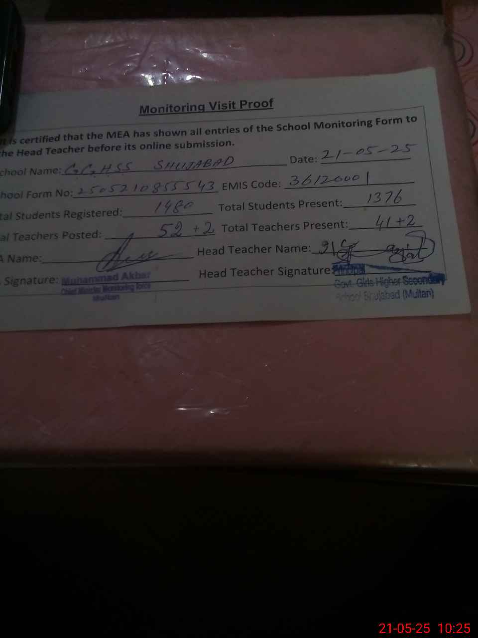 | Certified that this School was Inspected by the Undersigned MEA/DMO Today and the Information Stated Above is as Per Record. | |||||