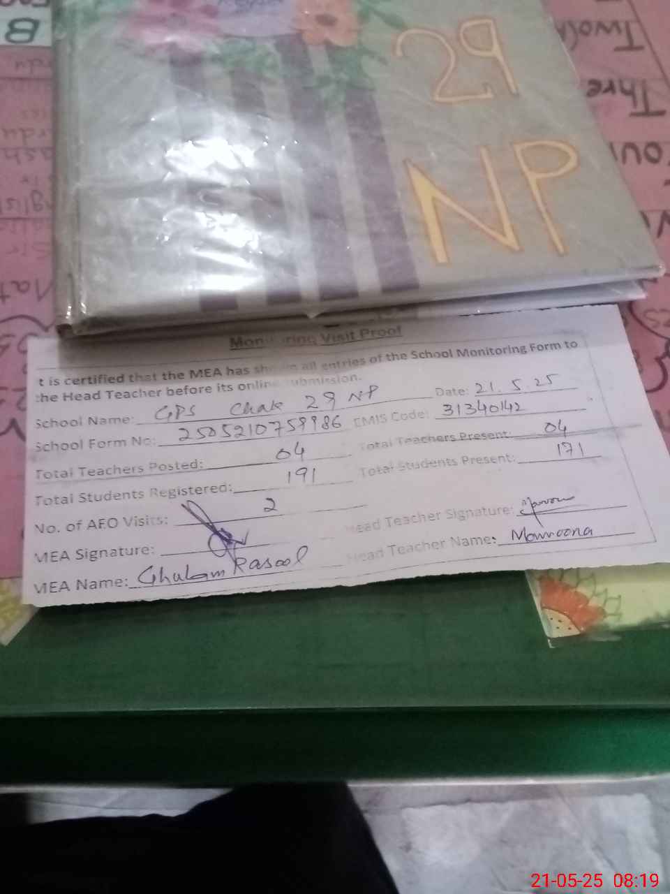 | Attendance Register | Head Teacher | MEA with School | Visit Proof |