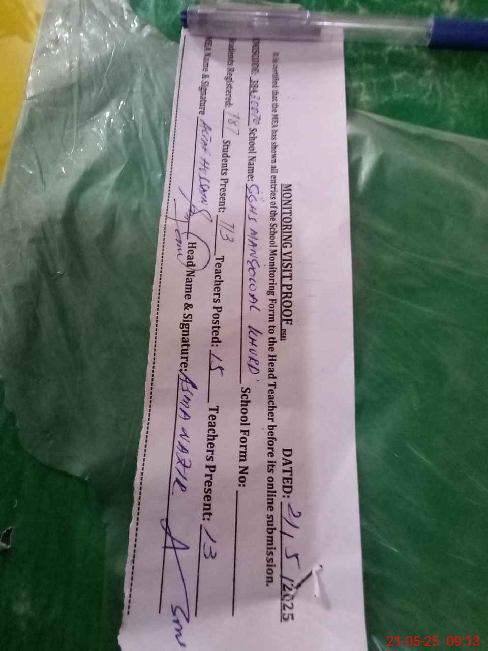 | Attendance Register | Head Teacher | MEA with School | Visit Proof |