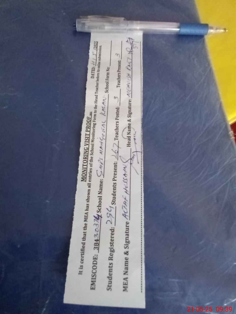 | Attendance Register | Head Teacher | MEA with School | Visit Proof |