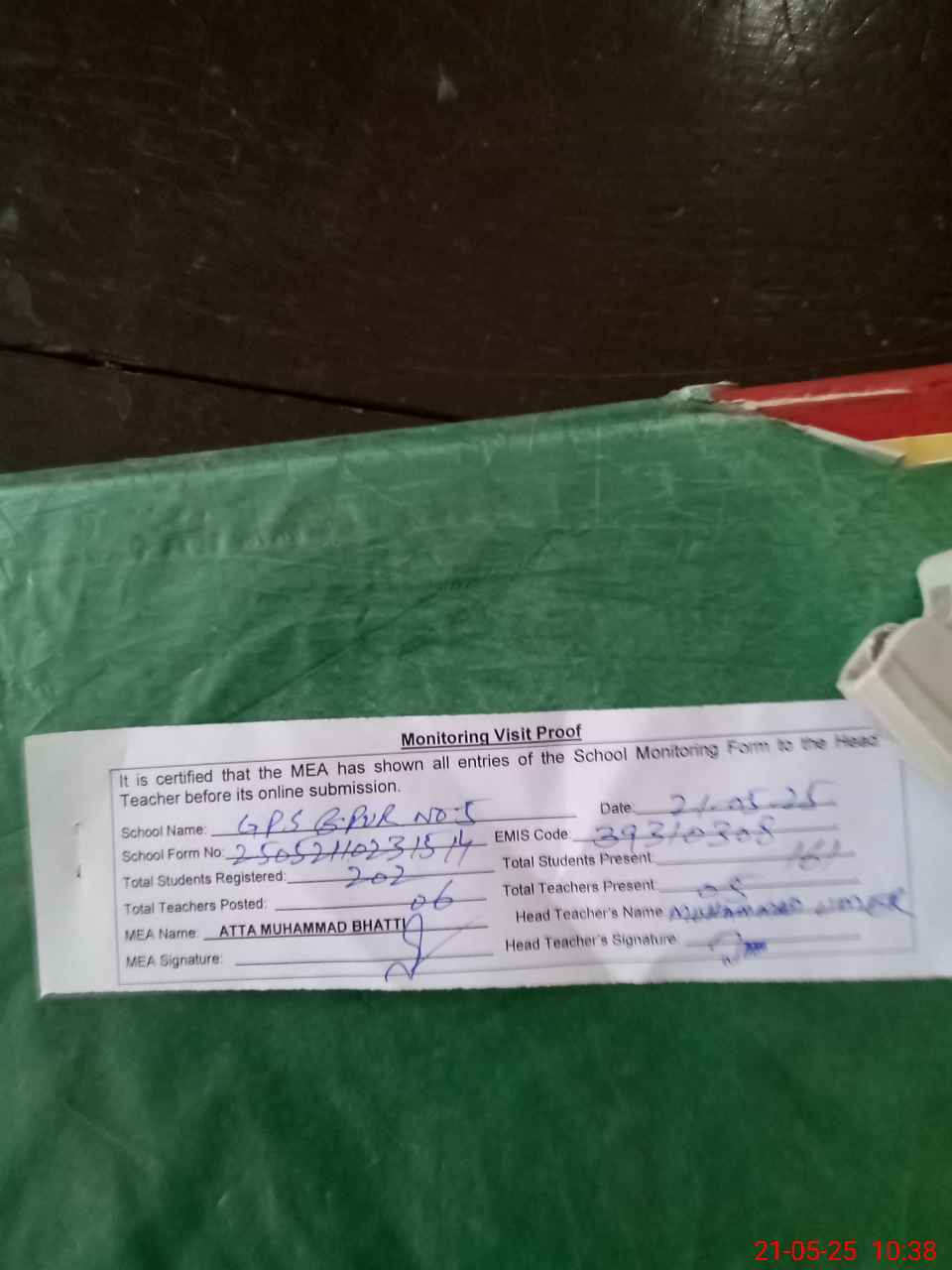 | Attendance Register | Head Teacher | MEA with School | Visit Proof |