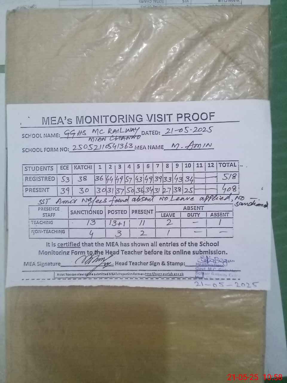 | EMIS Code: 36430076 | Name of School: GGHS MC RAILWAY COLONY, MIAN CHANNU | |||