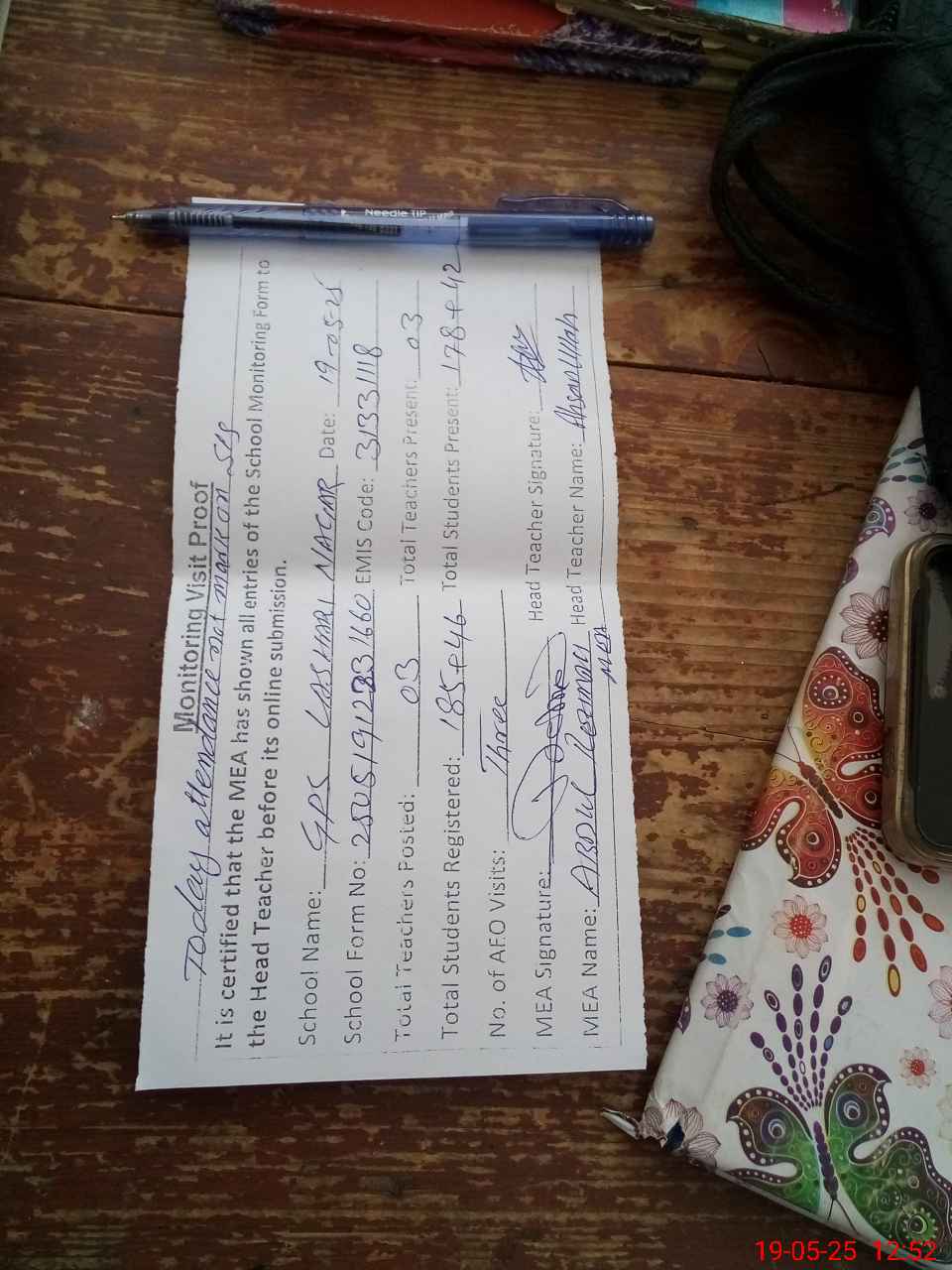 | Attendance Register | Head Teacher | MEA with School | Visit Proof |