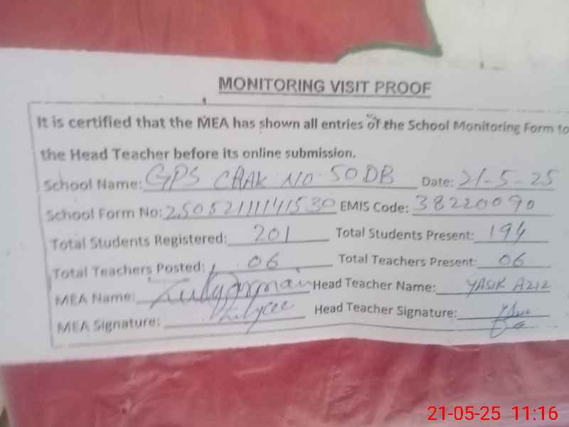 | EMIS Code: 38220090 | Name of School: GES CHAK NO. 50/DB | |||
