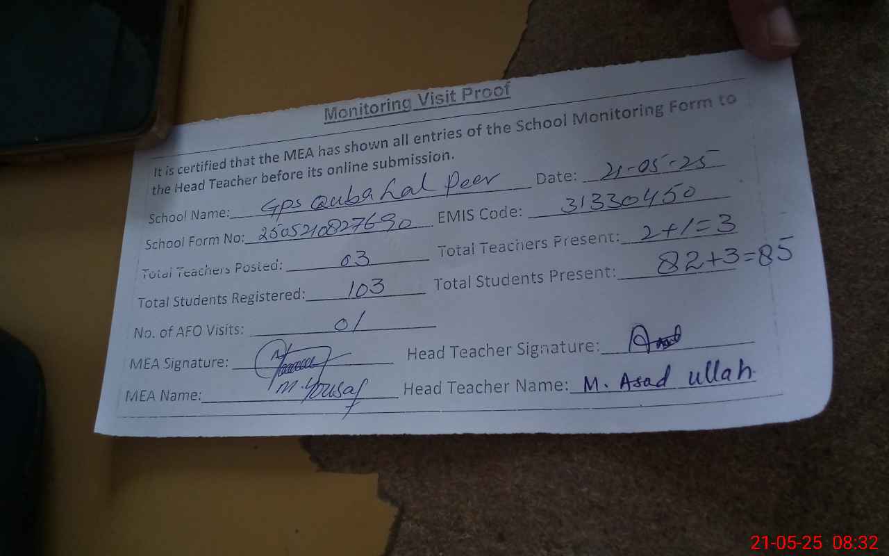 | EMIS Code: 31330450 | Name of School: GPS QUBA LAL PEER | |||