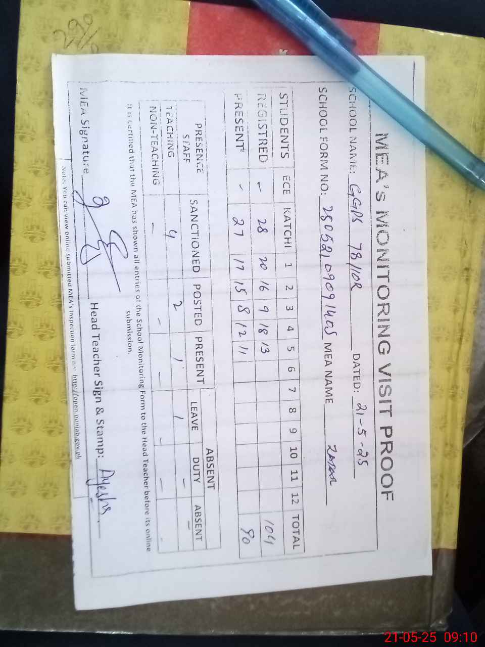| Attendance Register | Head Teacher | MEA with School | Visit Proof |