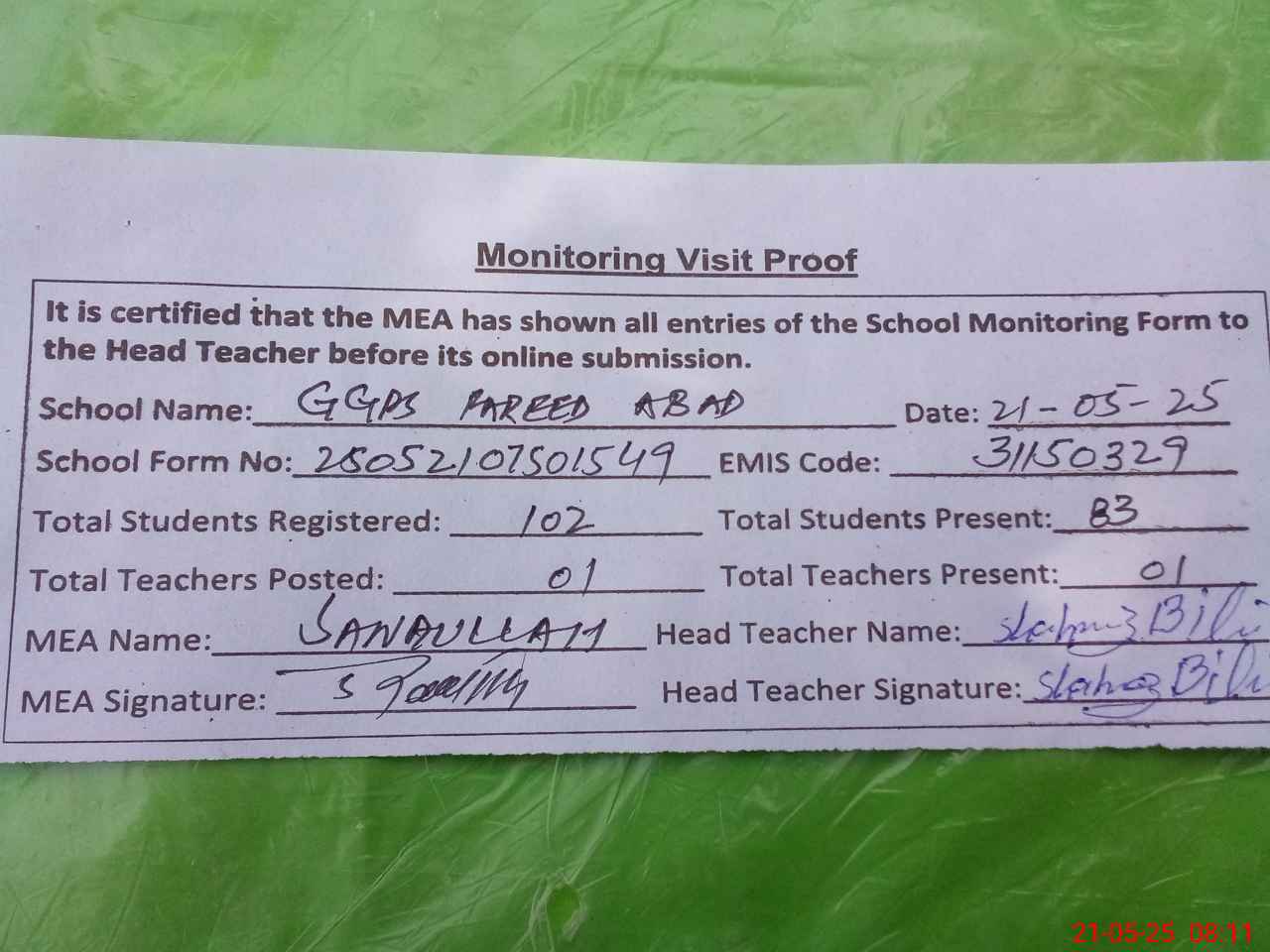 | Attendance Register | Head Teacher | MEA with School | Visit Proof |