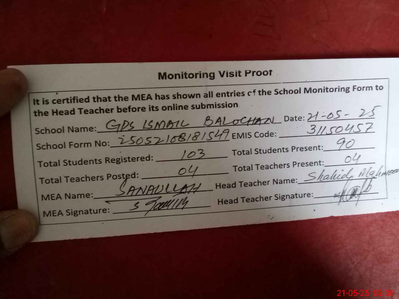 | EMIS Code: 31150457 | Name of School: GPS ISMAEEL BALOCHAN | |||