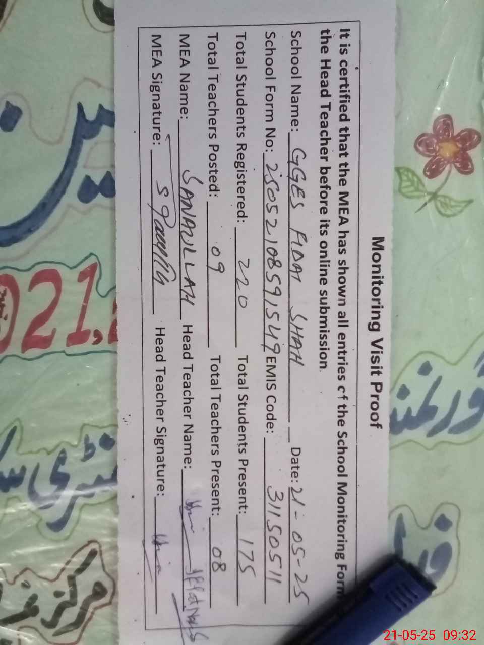 | EMIS Code: 31150511 | Name of School: GGES FADAI SHAH | |||