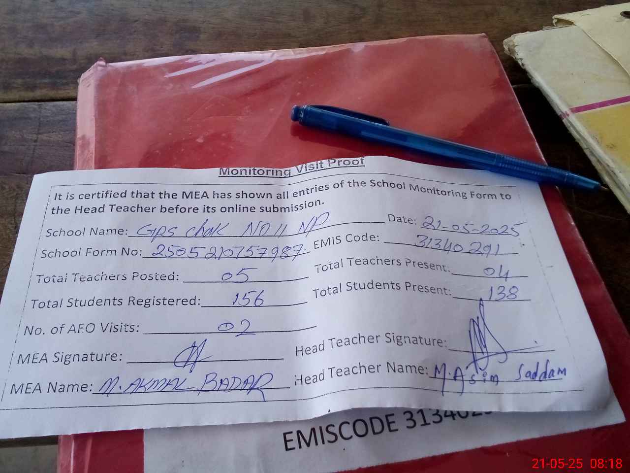 | Attendance Register | Head Teacher | MEA with School | Visit Proof |