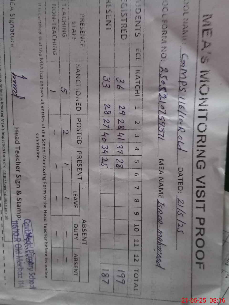 | Attendance Register | Head Teacher | MEA with School | Visit Proof |