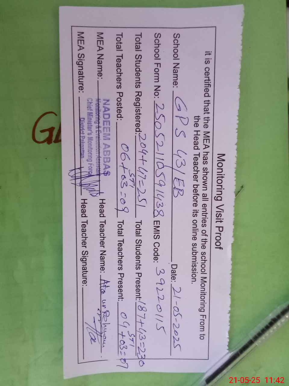 | Attendance Register | Head Teacher | MEA with School | Visit Proof |
