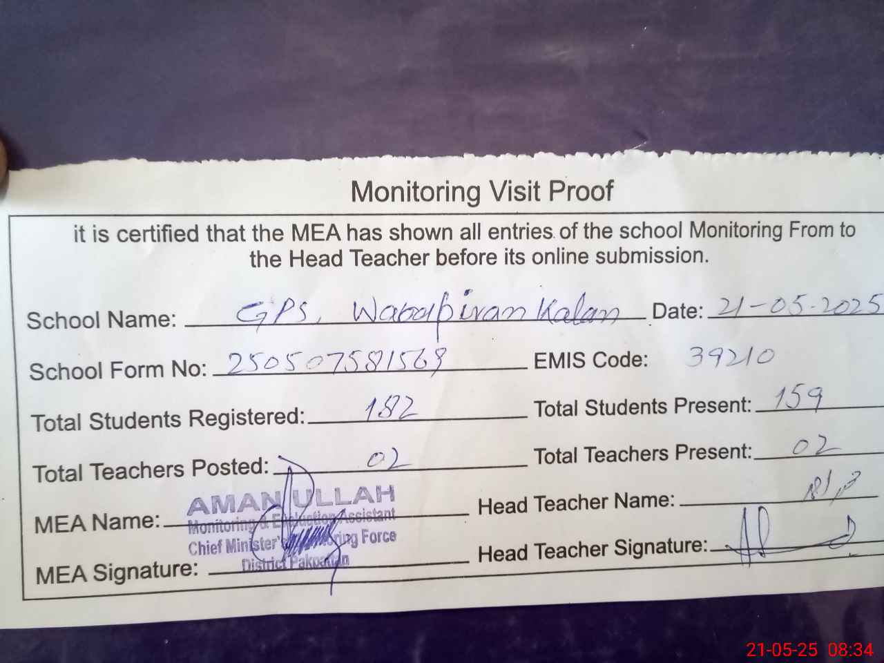 | EMIS Code: 39210154 | Name of School: GPS WARRA PIRAN KALAN | |||