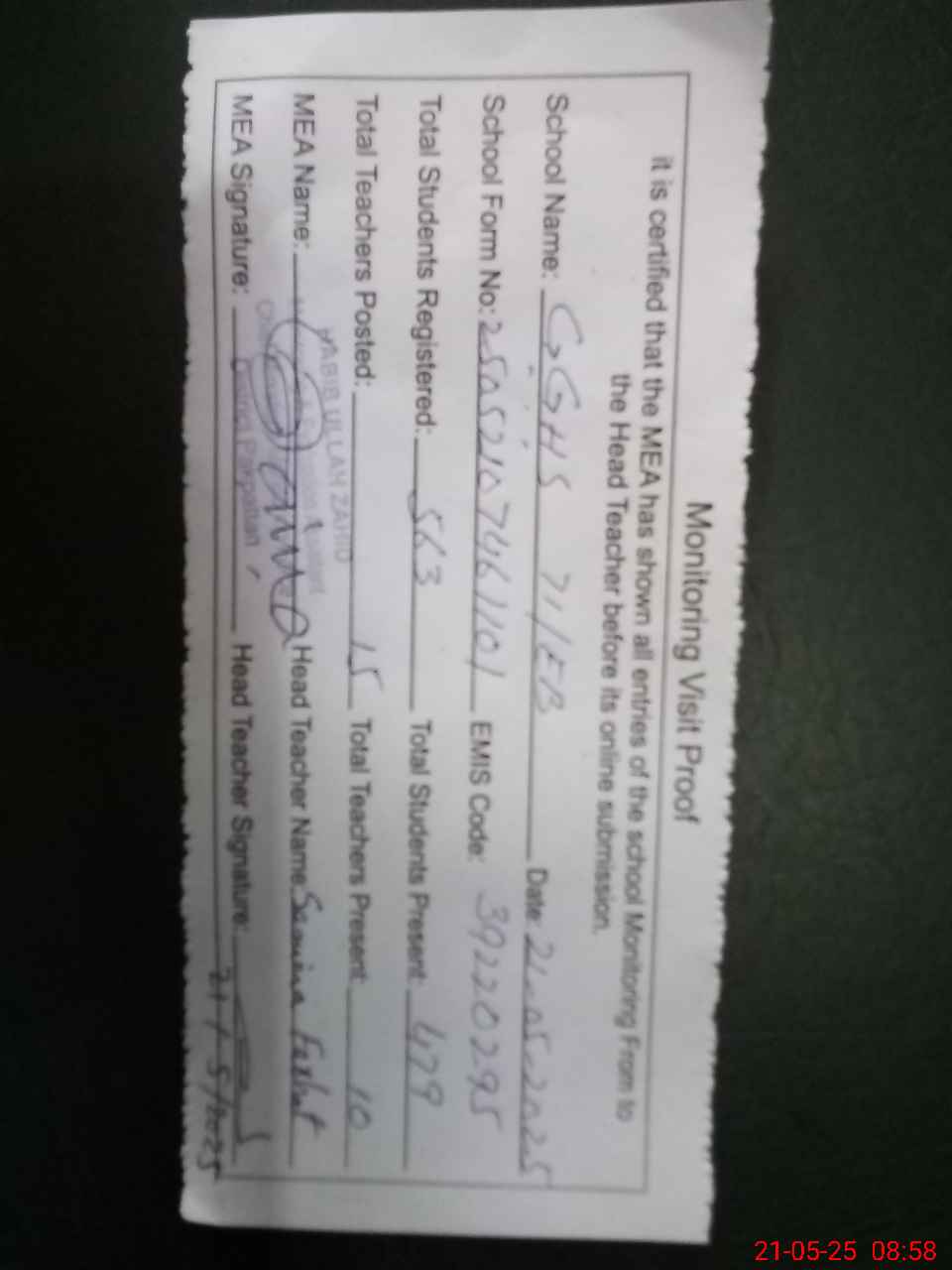 | Certified that this School was Inspected by the Undersigned MEA/DMO Today and the Information Stated Above is as Per Record. | |||||