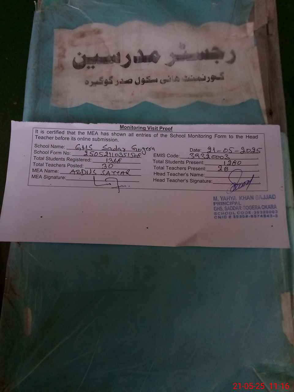 | Attendance Register | Head Teacher | MEA with School | Visit Proof |