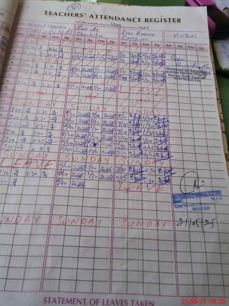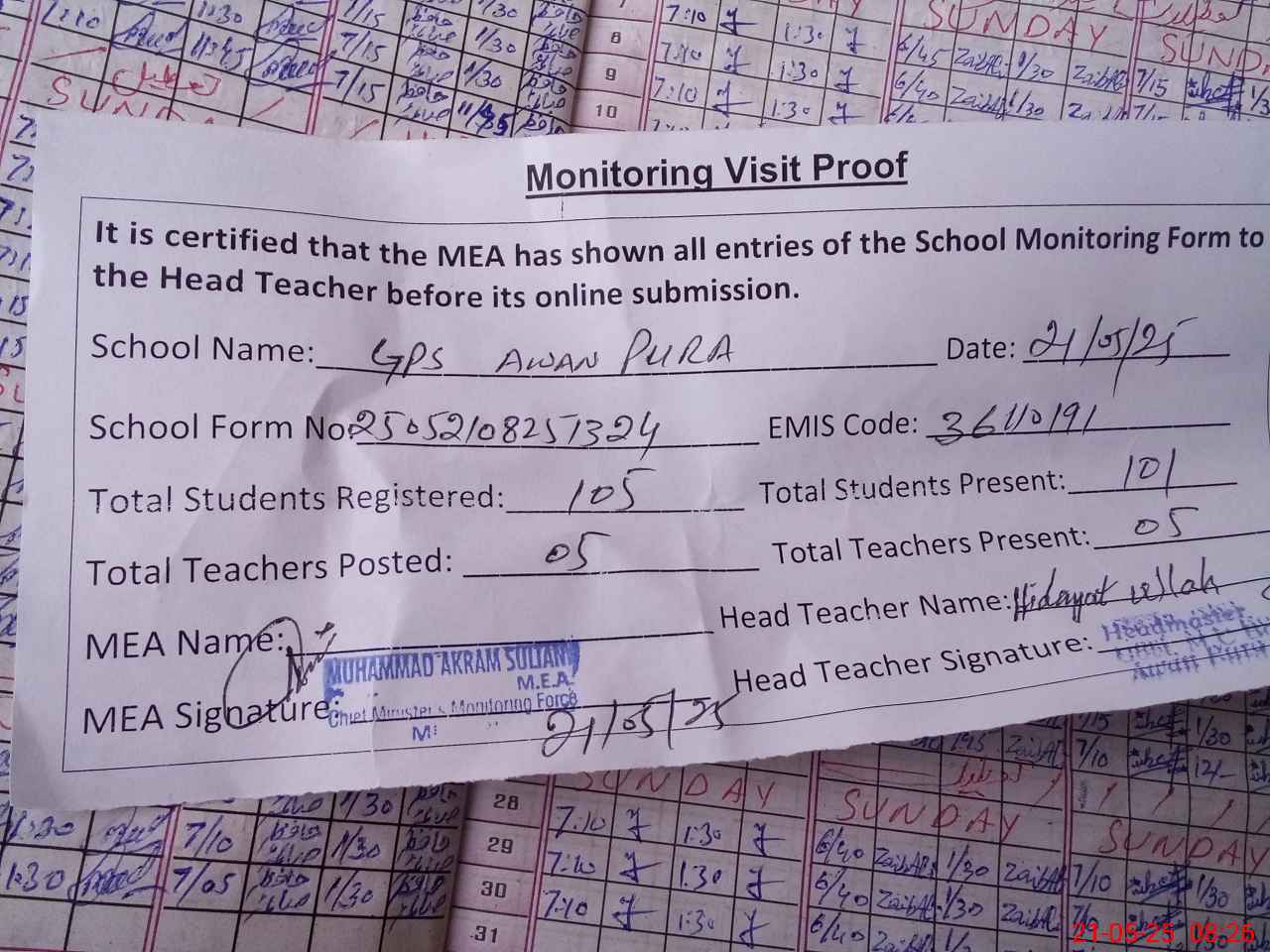 | Attendance Register | Head Teacher | MEA with School | Visit Proof |