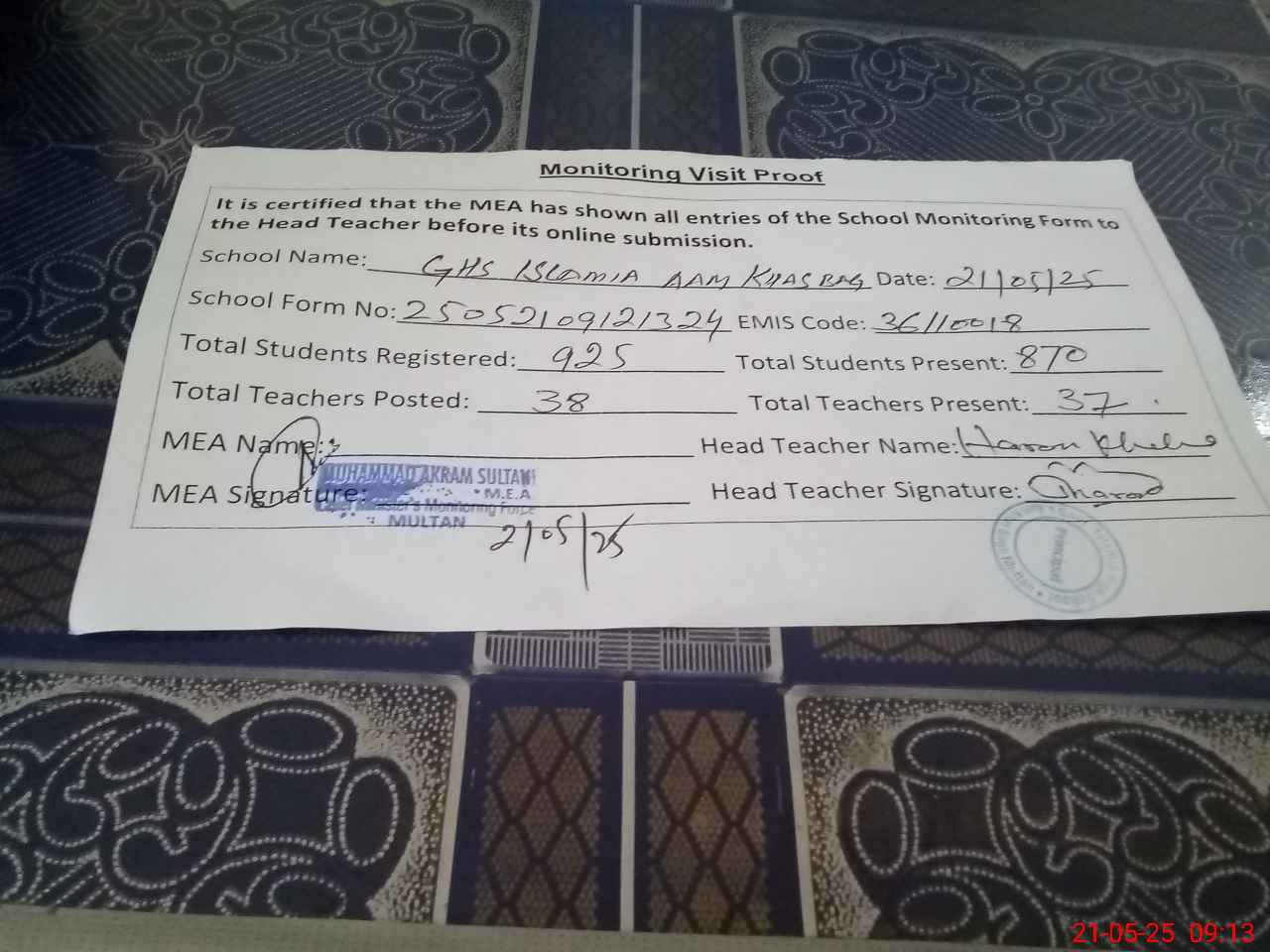 | Attendance Register | Head Teacher | MEA with School | Visit Proof |