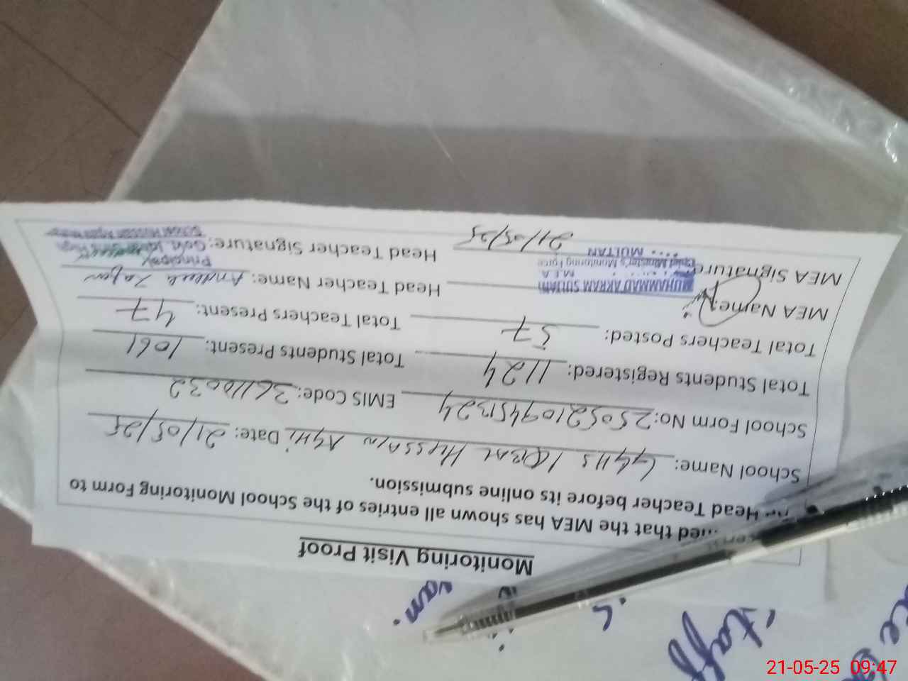| Attendance Register | Head Teacher | MEA with School | Visit Proof |
