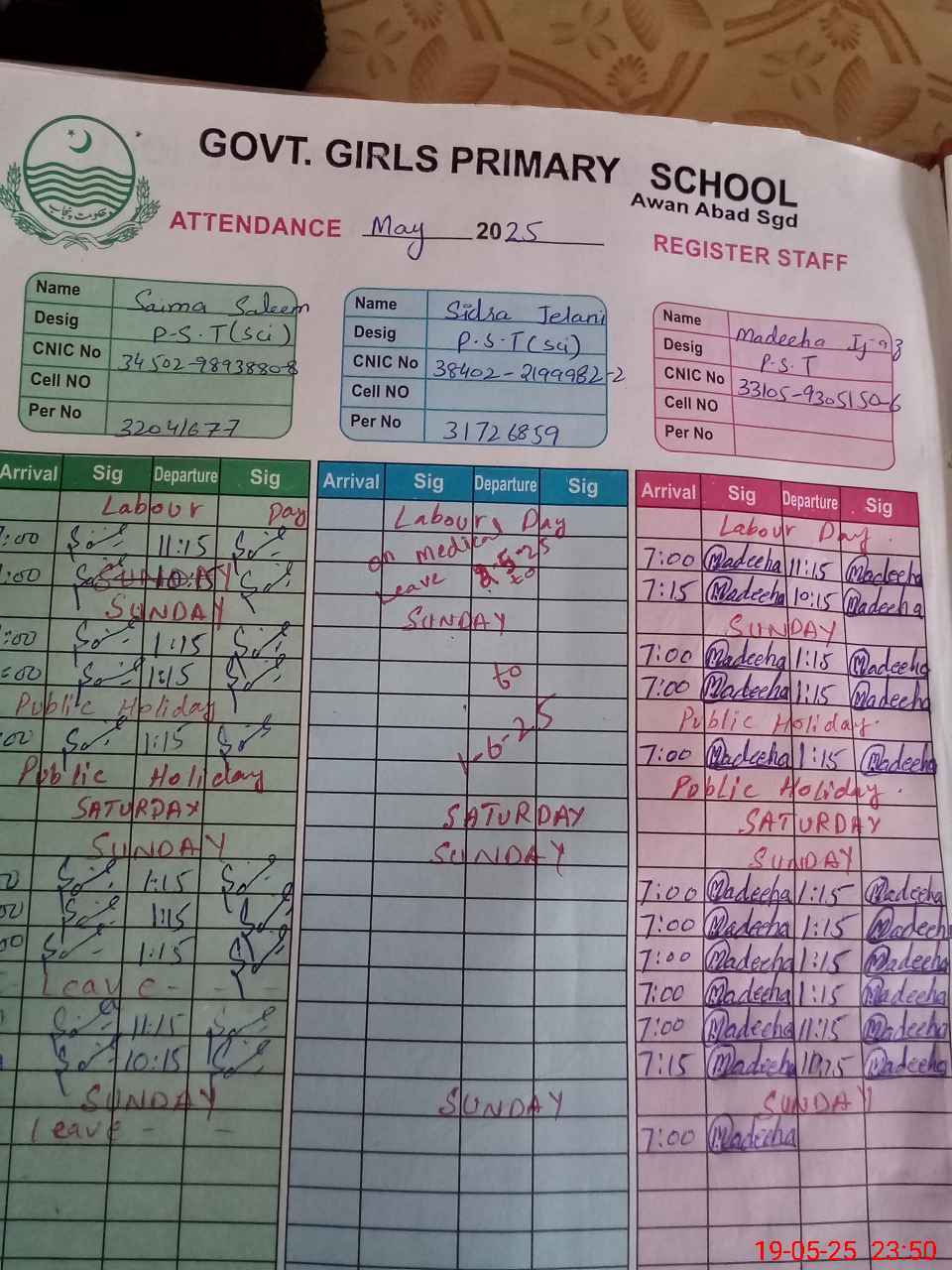| CNIC | Full Name | Designation | R/C | Absence During Last Calender Month |