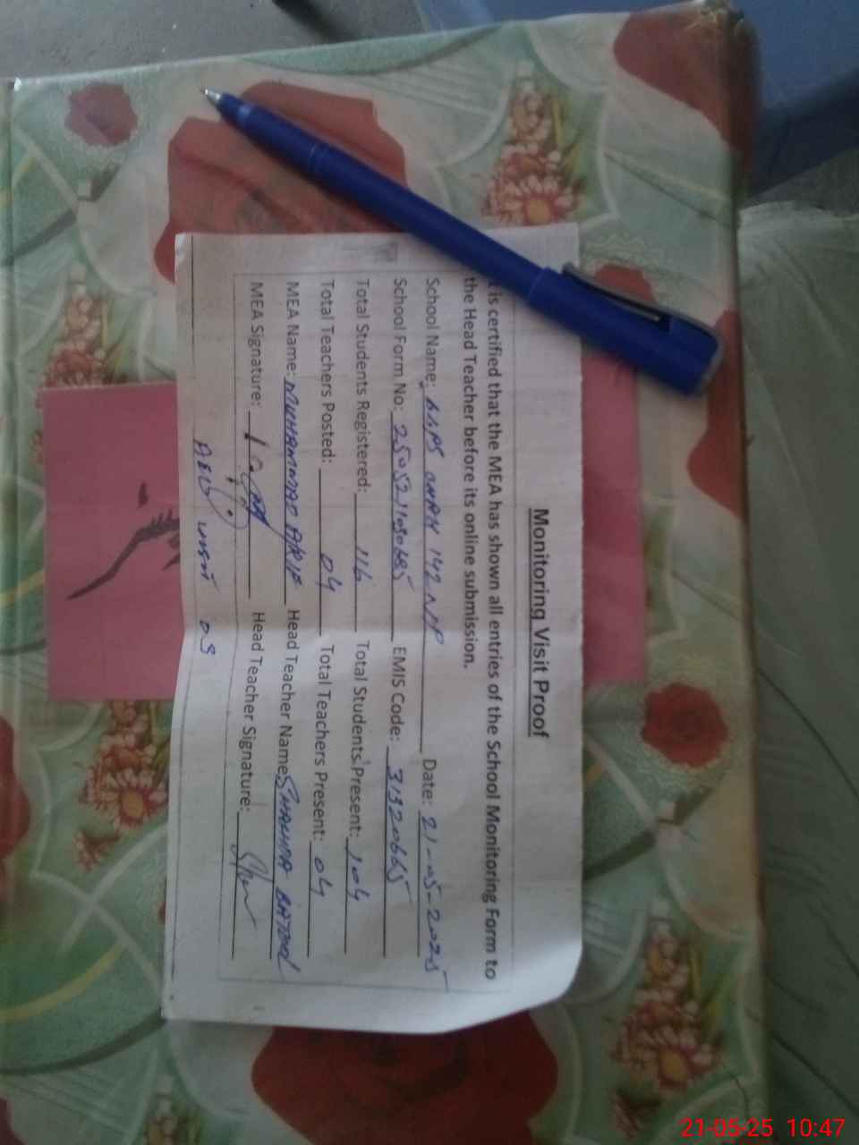 | Attendance Register | Head Teacher | MEA with School | Visit Proof |