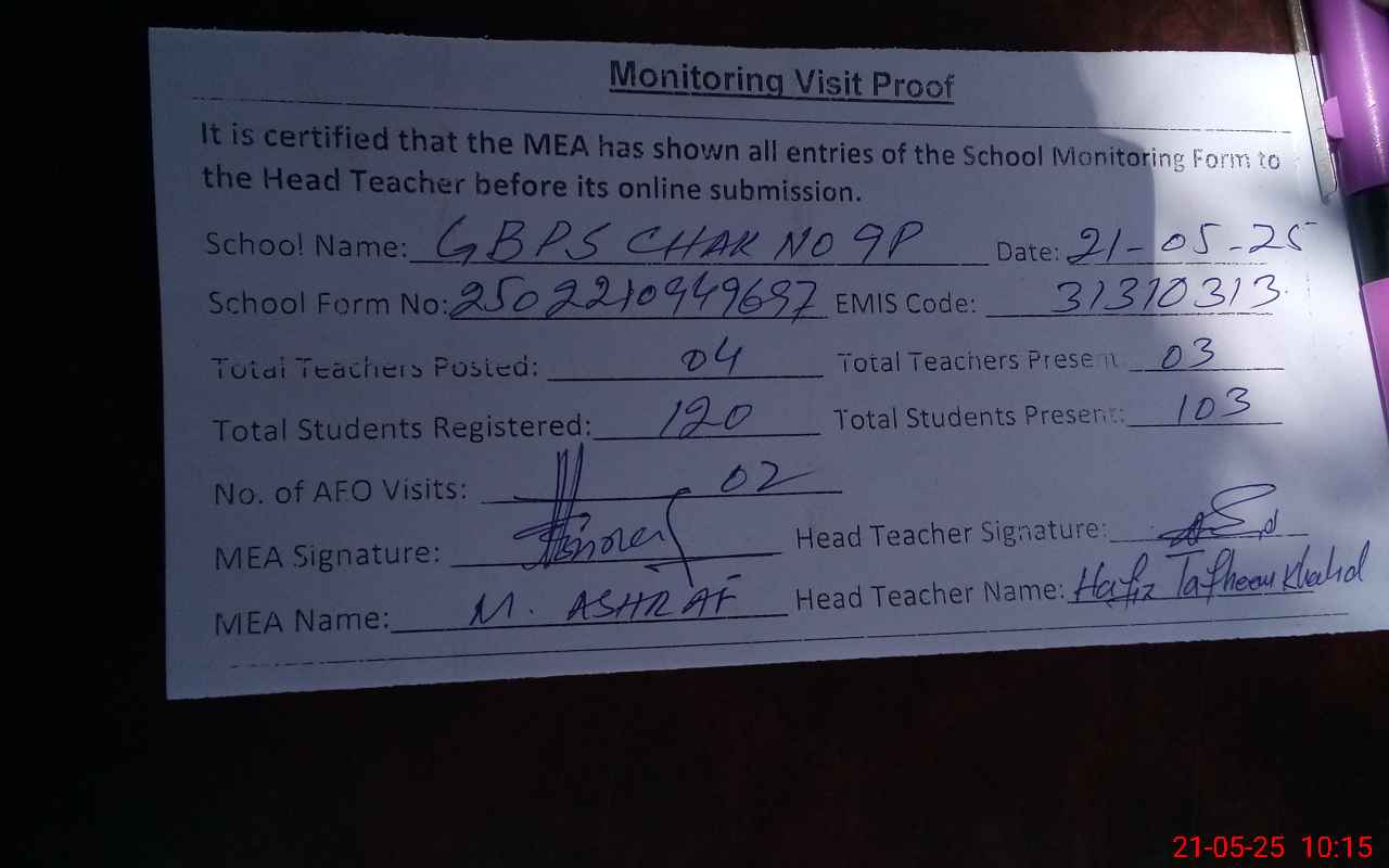 | EMIS Code: 31310313 | Name of School: GPS CHAK NO. 9/P | |||