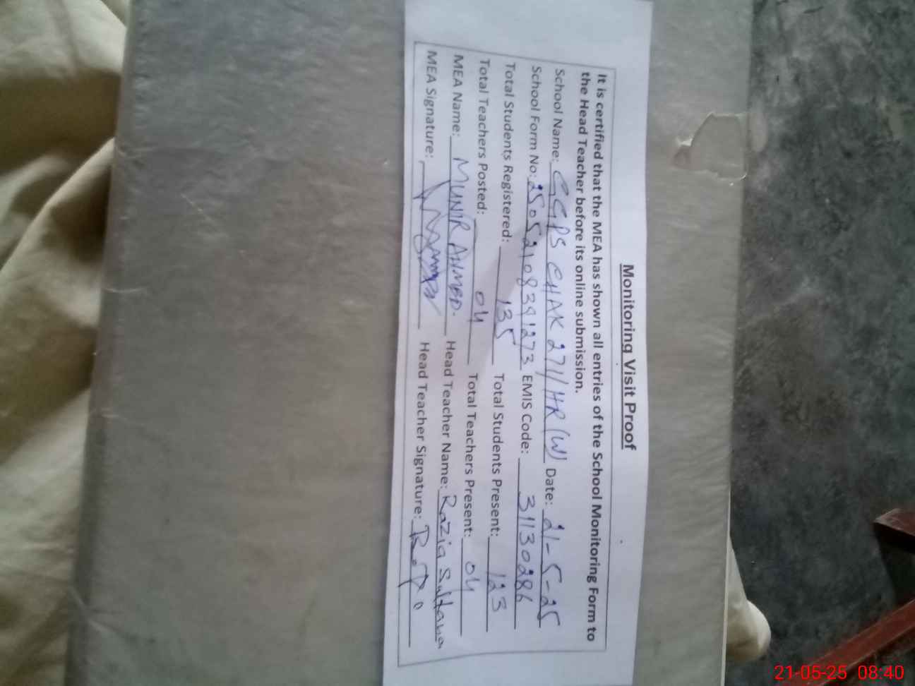 | Certified that this School was Inspected by the Undersigned MEA/DMO Today and the Information Stated Above is as Per Record. | |||||