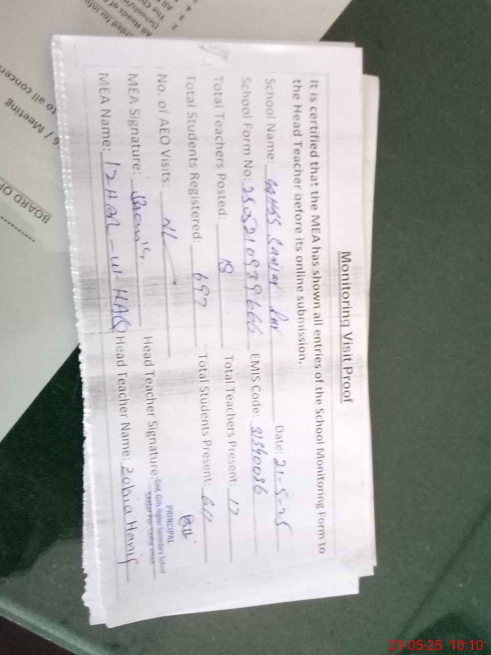| Certified that this School was Inspected by the Undersigned MEA/DMO Today and the Information Stated Above is as Per Record. | |||||