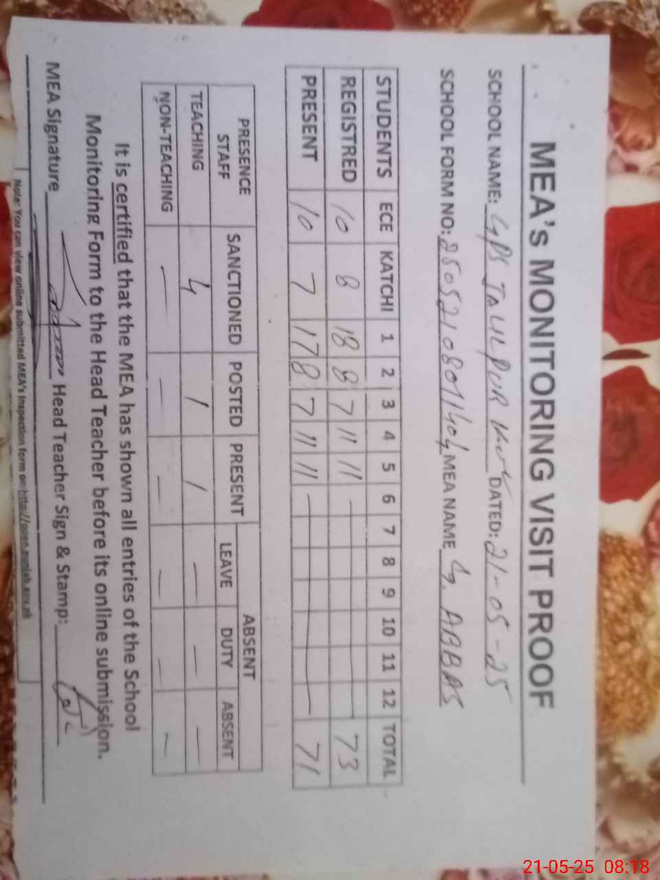 | Attendance Register | Head Teacher | MEA with School | Visit Proof |
