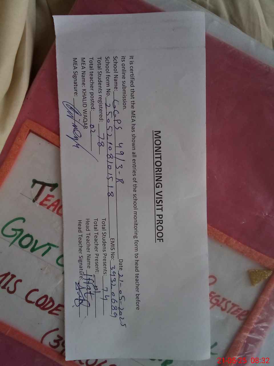| Attendance Register | Head Teacher | MEA with School | Visit Proof |