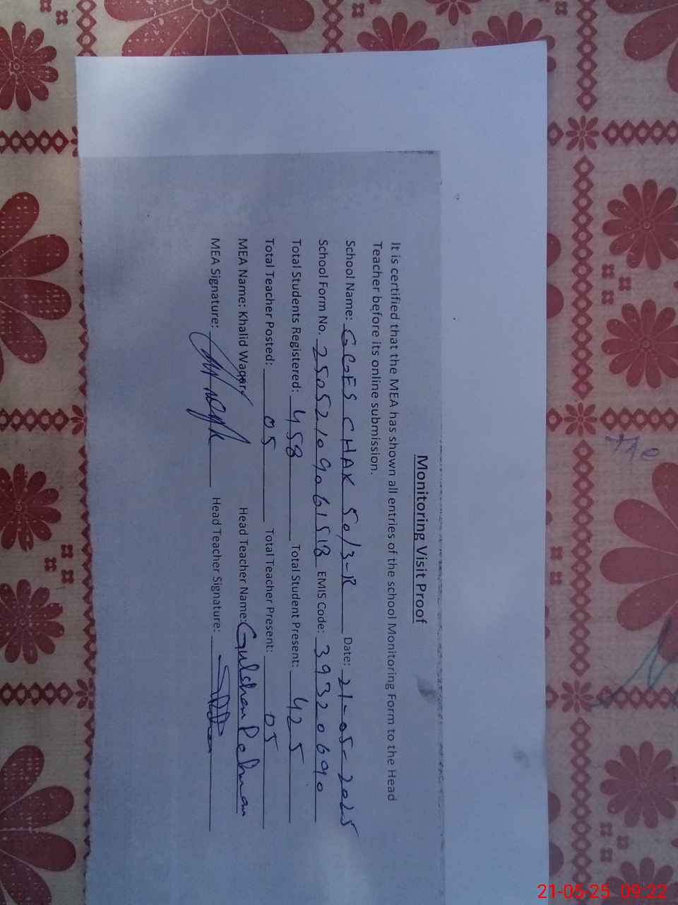 | Attendance Register | Head Teacher | MEA with School | Visit Proof |