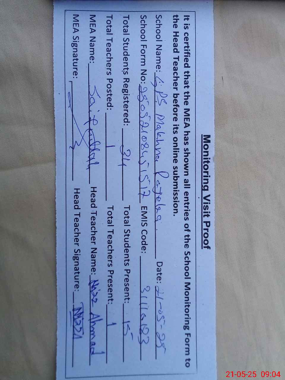 | Attendance Register | Head Teacher | MEA with School | Visit Proof |