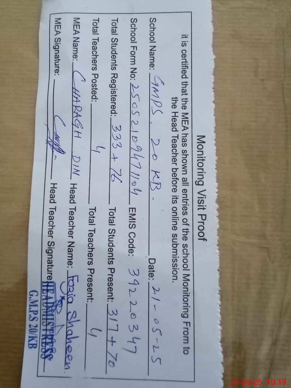 | EMIS Code: 39220347 | Name of School: GMPS CHAK NO. 20 KB | |||