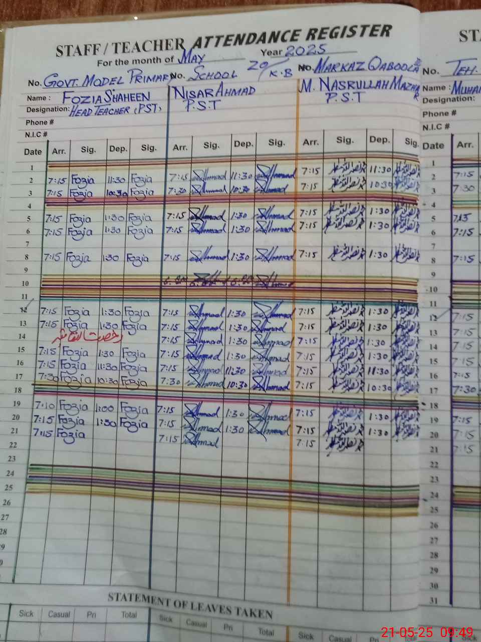 | CNIC | Full Name | Designation | R/C | Absence During Last Calender Month |
