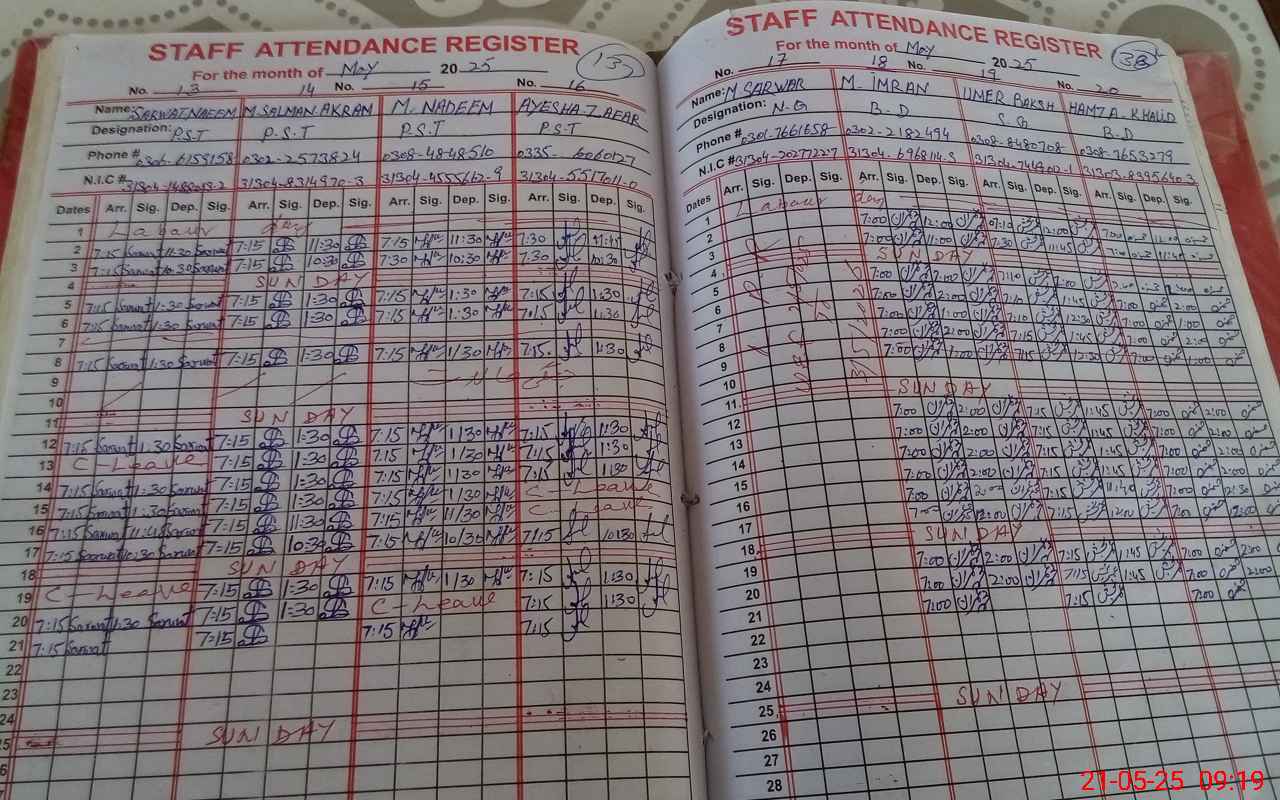 | CNIC | Full Name | Designation | R/C | Absence During Last Calender Month |