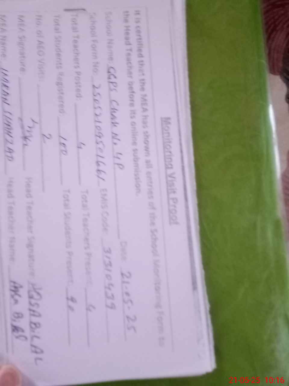 | Name: Aq**** Bi**** Designation: (School Headmaster's/Headmistress's) EST G Phone/Cell Number: 03**** |