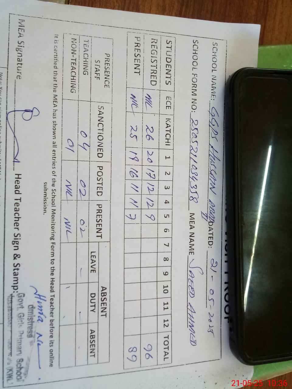 | Attendance Register | Head Teacher | MEA with School | Visit Proof |