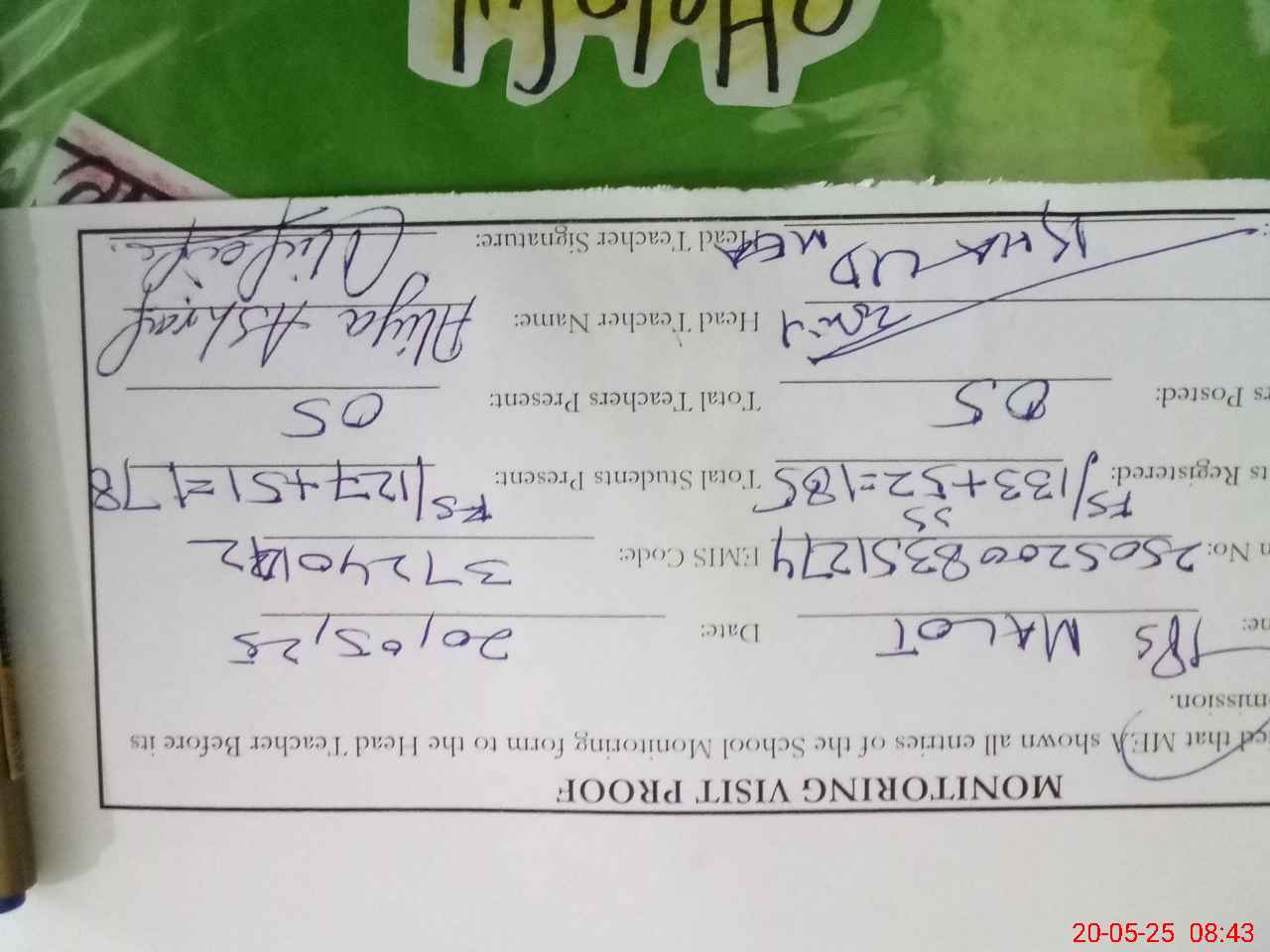 | Attendance Register | Head Teacher | MEA with School | Visit Proof |