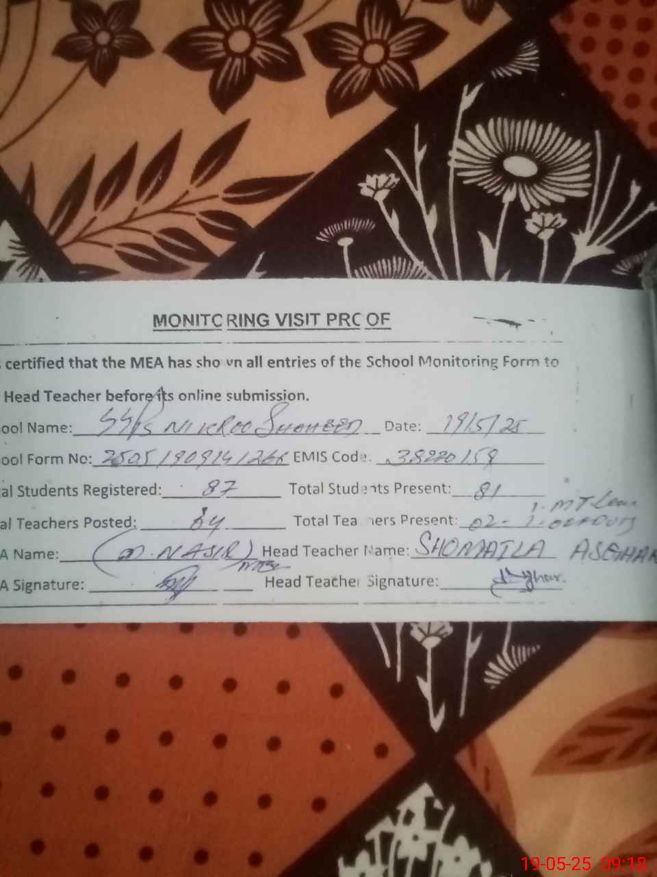 | Attendance Register | Head Teacher | MEA with School | Visit Proof |