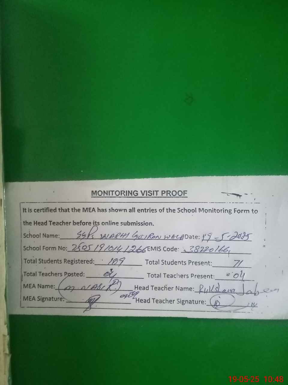 | Attendance Register | Head Teacher | MEA with School | Visit Proof |