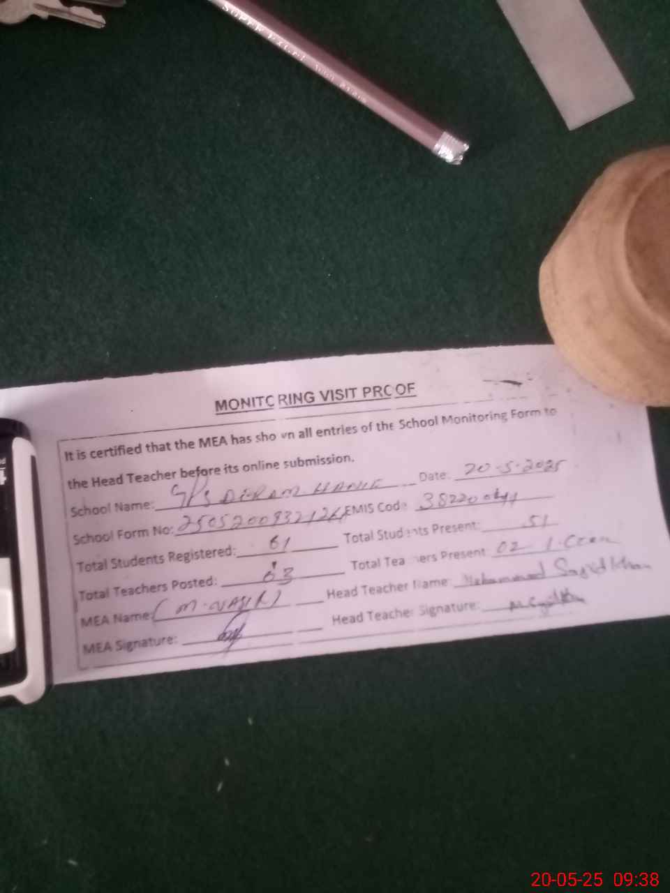 | Attendance Register | Head Teacher | MEA with School | Visit Proof |